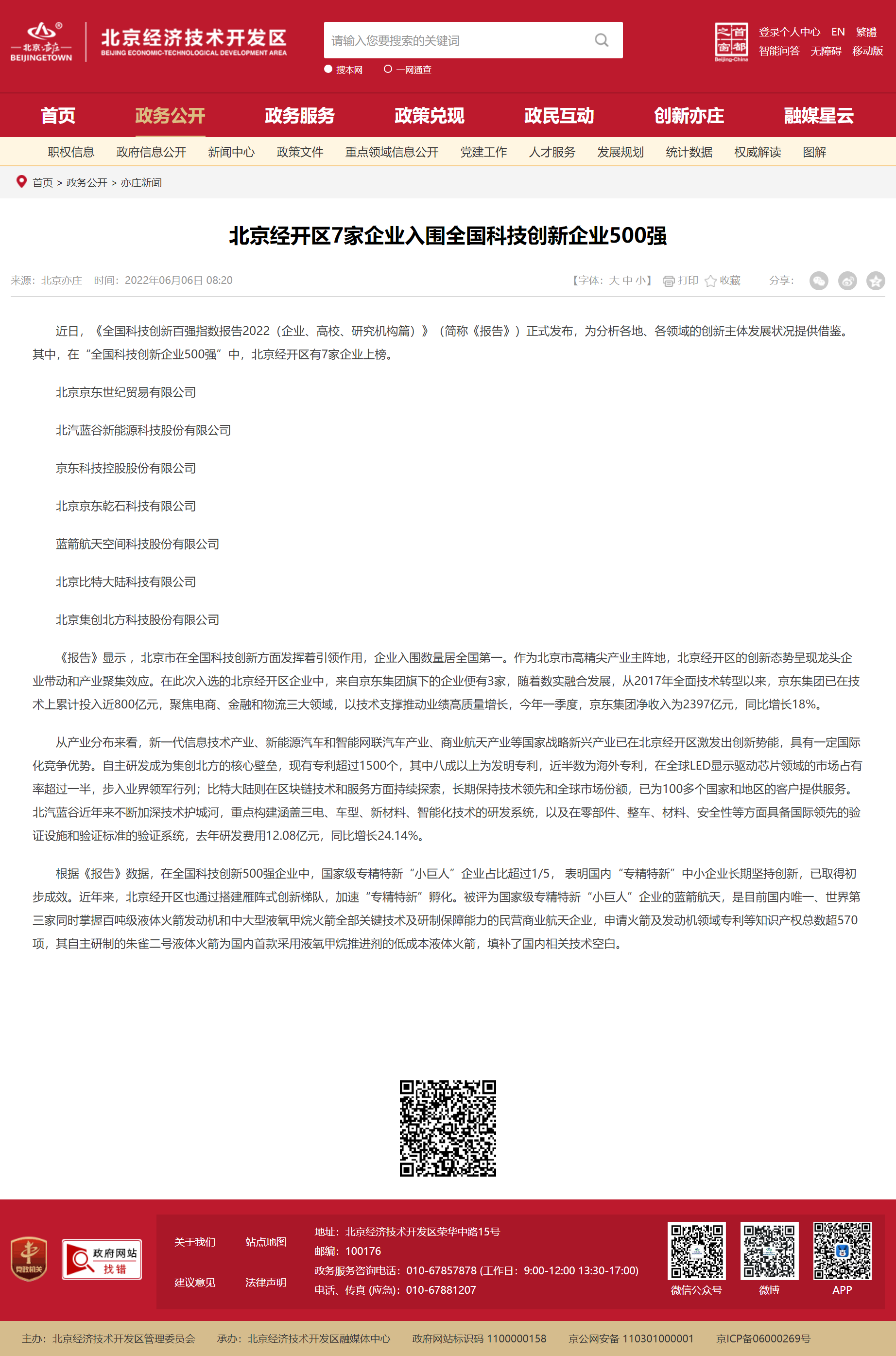《北京經濟技術開發區》:北京經開區7家企業入圍全國科技創新企業500強