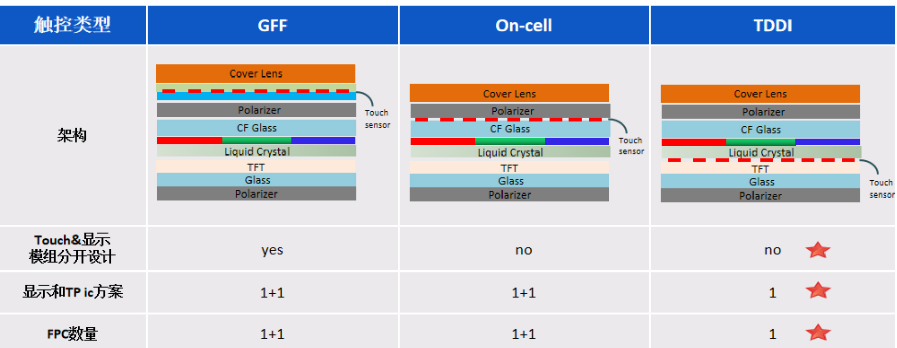 2. On-cell方案是指將Touch sensor嵌入到顯示屏的彩色濾光片基板和偏光片之間,即touch sensor做到顯示上玻璃,顯示和觸控模組二合一了,但ic和FPC還是分開兩套設計。3. TDDI方案將Touch sensor完全集成到了顯示TFT面板內,實現了顯示觸控模組、IC以及FPC全部二合一,為顯示觸控高度集成一體化方案。