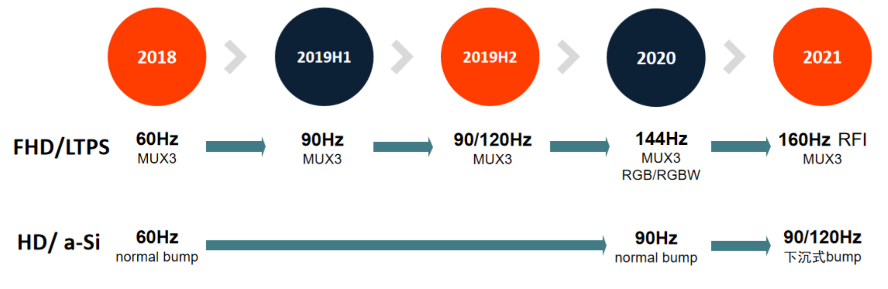 HD a-Si TDDI已實現90Hz量產,新開下沉式bump ic已可支援120Hz,針對HD 120Hz規格顯示屏已不是瓶頸且沒有成本的增加,待有成本匹配的主板套片,終端對應規劃開案,HD也將有可能升級為120Hz。