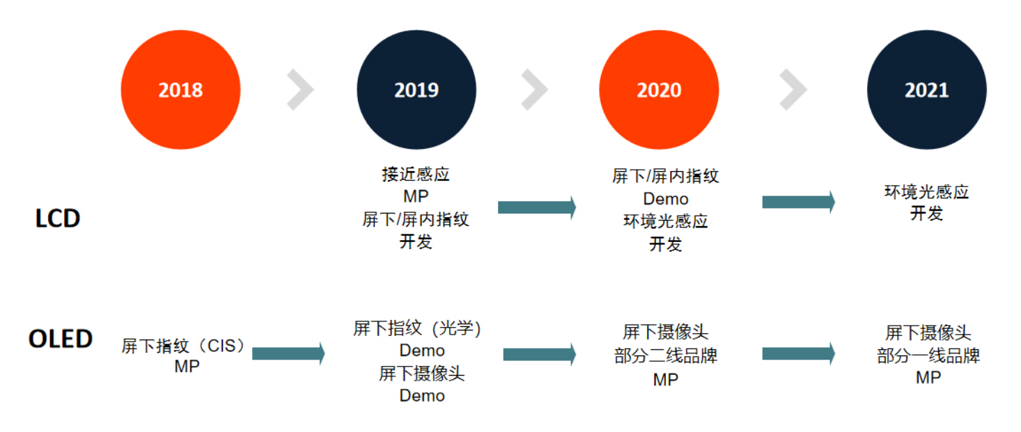 1.屏下/屏內指紋2.LCD屏下指紋技術為在顯示模組背光下疊加CIS+紅外的方案,成本貴,模組厚度增加,該技術方案已被放棄。3.屏內指紋技術分為在CF側和Array側兩種方案(類似觸控的oncell和incell方案架構),因成本增加較高目前也基本處于暫停開發狀態。