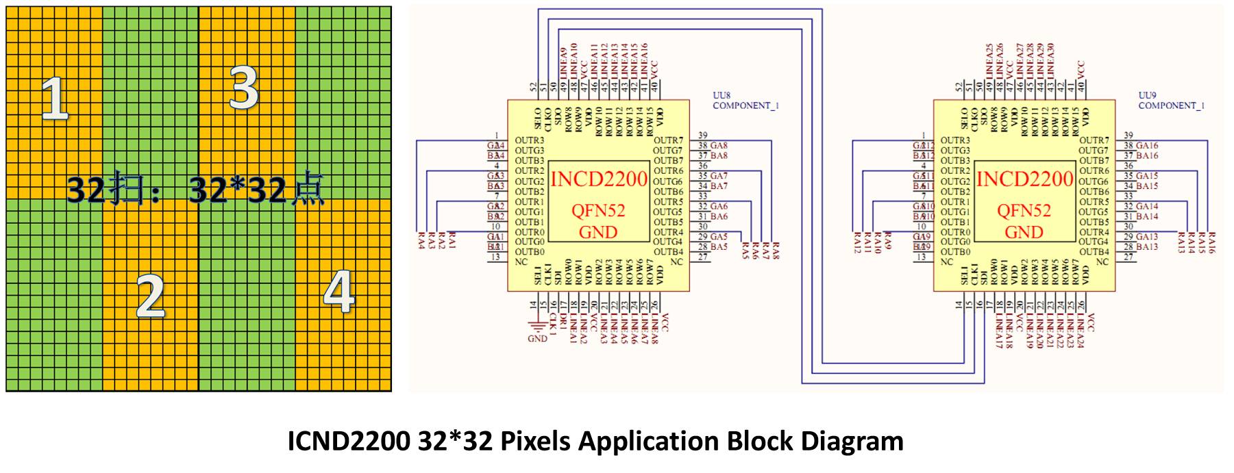 ICND2200采用創(chuàng)新的行列合一架構,內部集成24個恒流通道及16個行管,通過芯片級聯可擴展實現最大到32掃的區(qū)域控制,未來可升級到支持48掃和64掃。芯片級聯區(qū)域中行列共用組成控制區(qū)域,16掃應用下,單顆芯片控制區(qū)域為16行*8列;對應32掃,兩顆芯片級聯控制區(qū)域為32行*16列,下圖為32*32點控制區(qū)域示意圖,只需4顆ICND2200級聯擴展即可。