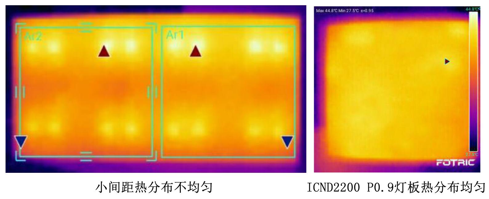 燈板溫度散熱不均是困擾LED小間距的另一大問題,由于通常行線設計一行帶載燈珠較多的原因,通常在大屏模組間有偏青問題,由于紅色燈珠電流大,往往紅色芯片處也是模組溫度最高的地方。目前,由于驅動方案的局限性,燈板熱分布不均問題始終無法得到改善。而ICND2200采用分區(qū)域方式,可均勻分開散熱,從而有效解決熱分布不均問題,進一步提高了燈板的穩(wěn)定可靠性。
