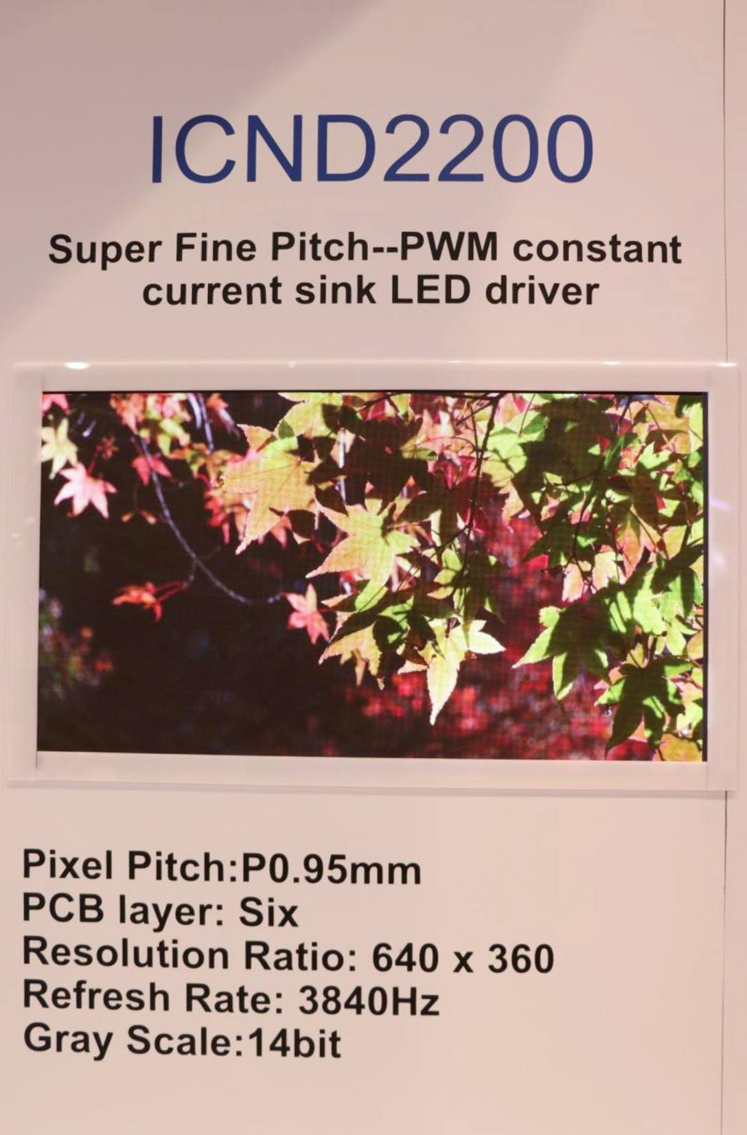 ICND2055和ICND2065這兩款代表了高性能小間距發展方向的PWM產品,體現了高度的智能化特性。ICND2055內置智能gamma轉換,可調整gamma值,進行智能動態節能,并在降EMI方面表現優異。ICND2065則在掃描數方面進一步提高,優于當前市面上PWM IC在P2.5 32掃的效果。它可用于COB解決方案,支持64掃的驅動IC能夠解決COB產品的PCB設計與成本問題。目前,國內外知名廠商都在陸續導入這兩款產品并進行批量生產,甚至有參展商伙伴已經開始展示。在8寸晶圓非常緊缺的時期,終端屏廠對高階驅動IC的需求尤為迫切,預計這兩款產品近期將迎來需求量高峰期。