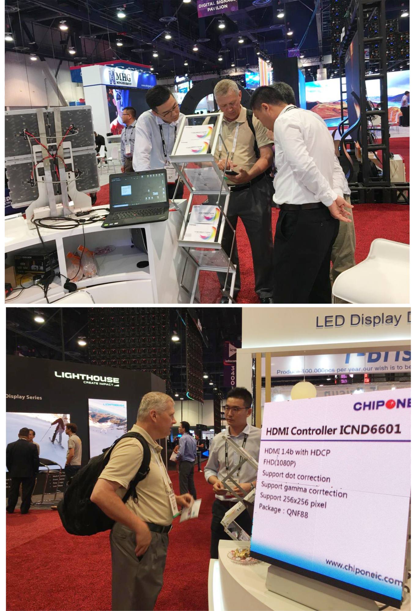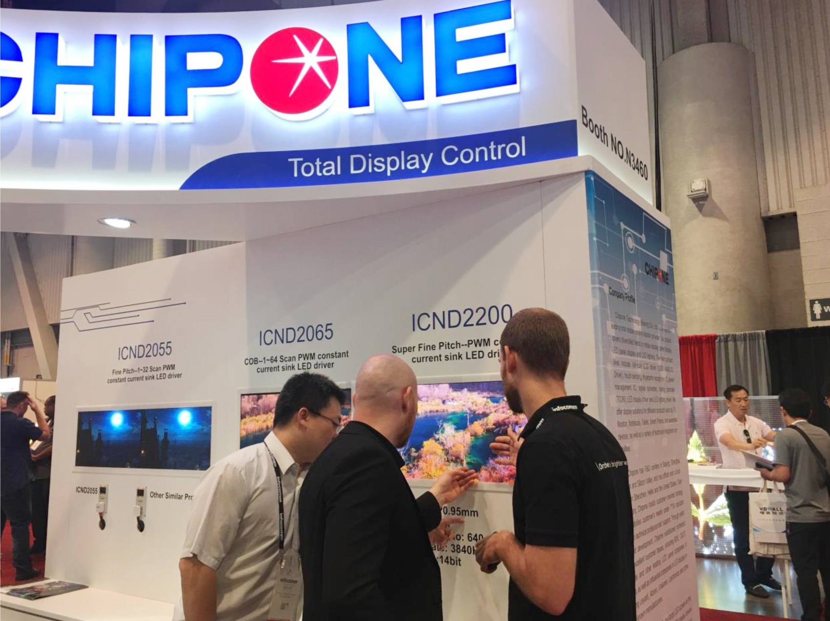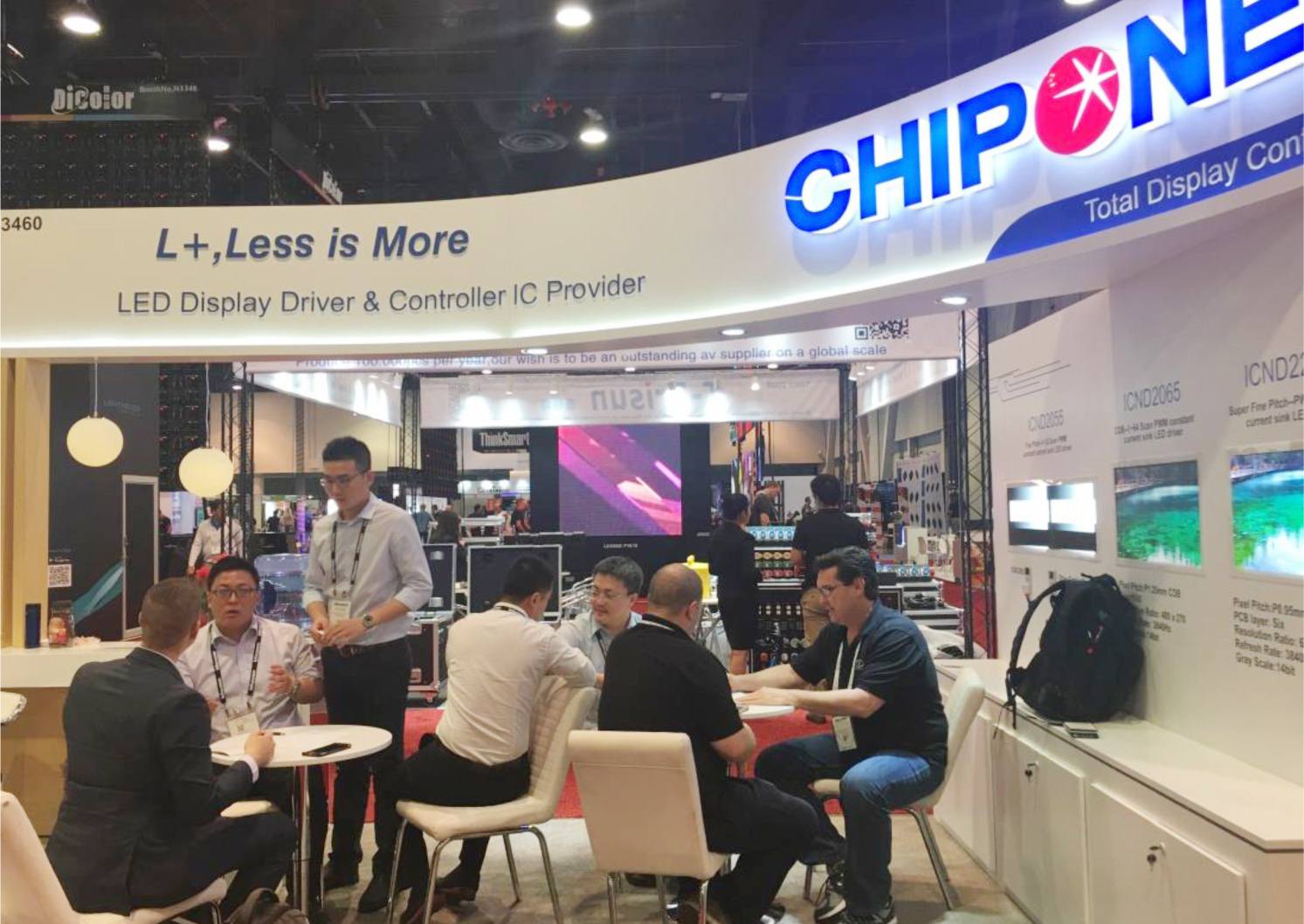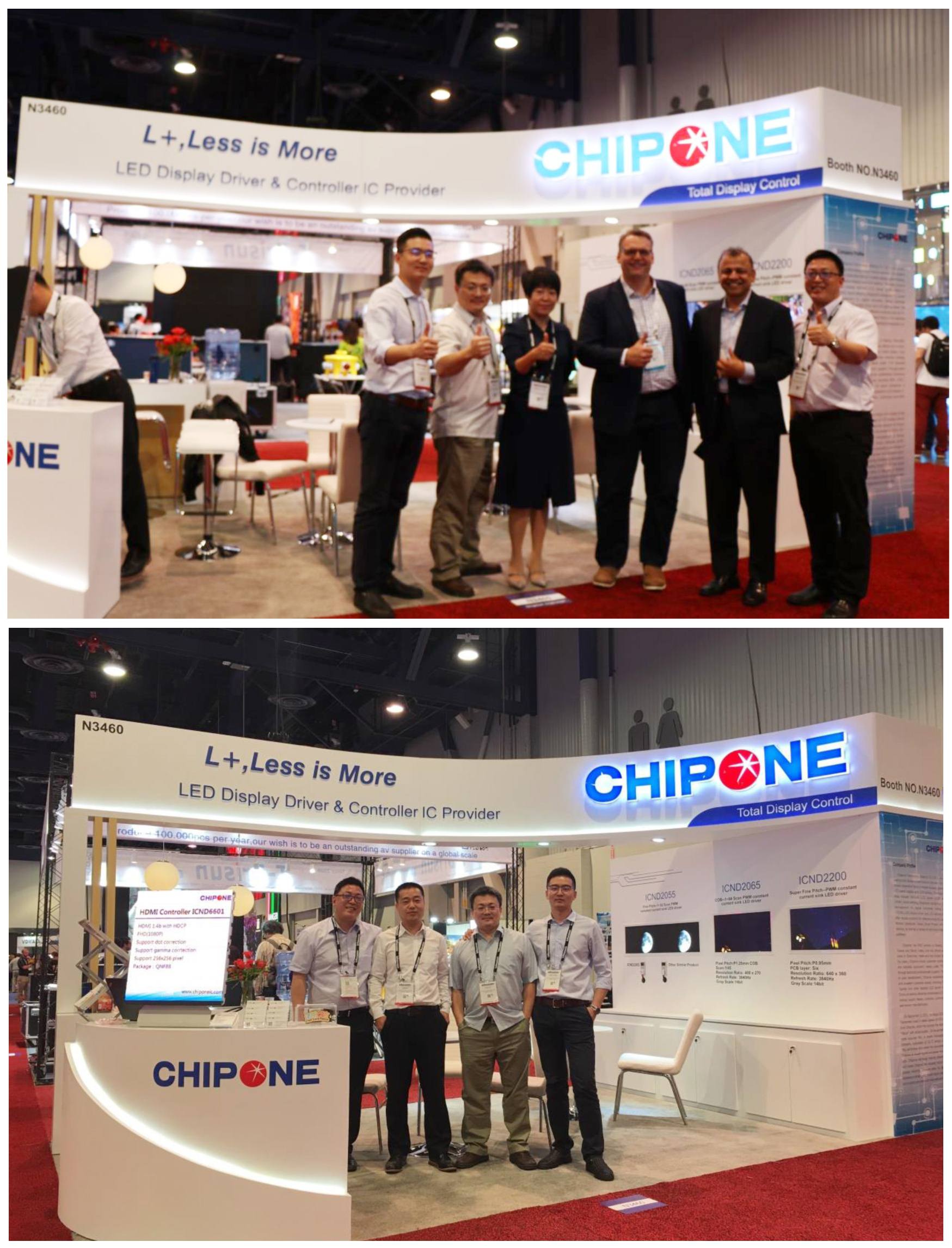 6月6日-8日,為期三天的視聽顯示技術與系統集成展會InfoComm在美國拉斯維加斯會展中心(LAS VEGAS CONVENTION CENTER)開幕。該展會由美國國際信息交流行業協會舉辦,在專業視聽、電子系統集成、燈光音響、智能建筑領域享譽全球,聚集了全球頂級的視聽技術、解決方案,為視聽廠商和專業用戶提供了寶貴的交流平臺。 集創北方攜多款行業領先產品首次亮相InfoComm USA展,展示了在LED顯示領域高智能、高集成、高品質的創新成果。此次展會上受到極大關注的L+產品系列,通過采用新協議、新架構以及更高的集成度,實現了雙線串行+行列合一+小封裝體的形式,能夠降低客戶端的綜合成本,通過智能化的控制以及統一的信號協議,進一步帶來設計流程上的簡化。其產品特征主要包括:簡化電路結構、降低PCB成本;統一信號協議,控制簡便;高集成架構,更好顯示效果;智能化控制,減少調試等等。 其中,ICND2200驅動IC是第一次點亮展出,專為超小間距LED顯示屏設計,具有創新的行列合一整合架構,雙線串行數據傳輸方式,單顆IC控制16x8像素,兩顆級聯控制32x16像素。ICND2200以0.95間距及PCB 僅6層的特點吸引了很多客戶駐足拍照,顯示效果較為突出。